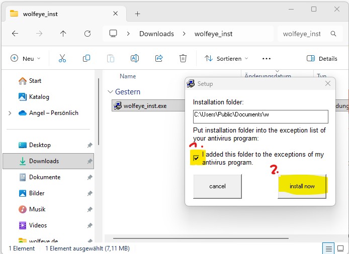 Após baixar e extrair o arquivo ZIP, você pode executar o aplicativo clicando duas vezes no arquivo .EXE. Certifique-se de colocar a pasta de instalação na lista de exceções do seu antivírus e confirme marcando “Adicionei esta pasta à exceção do meu programa antivírus”. Clique em “instalar agora” para instalar o Wolfeye: